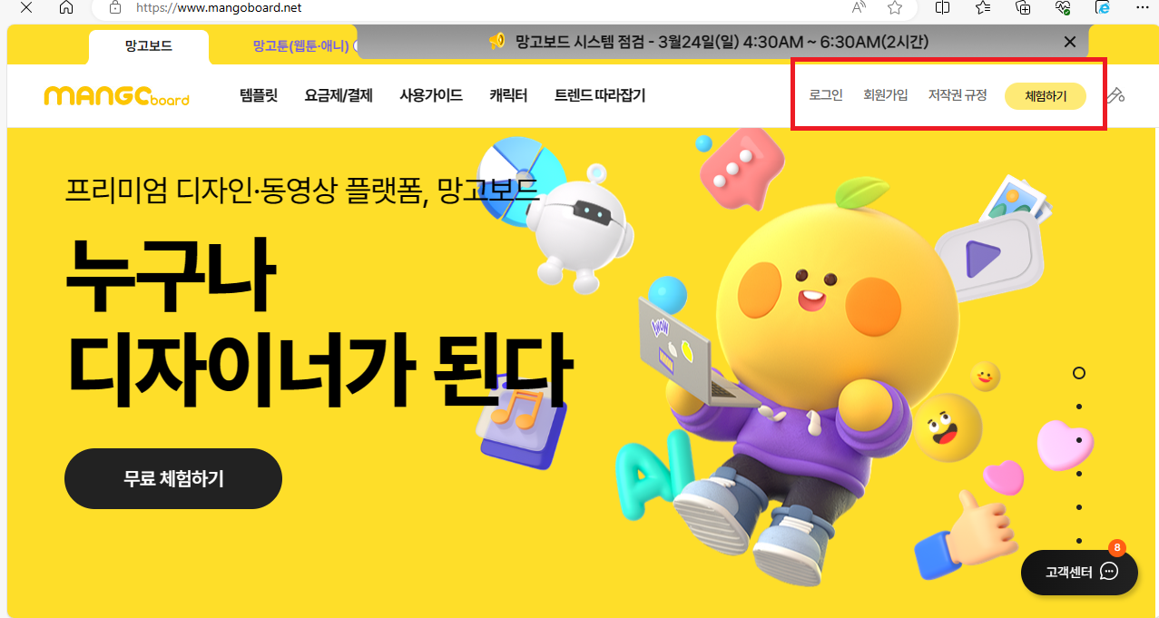 망고보드의 접속 후 회원가입을 진행해주세요