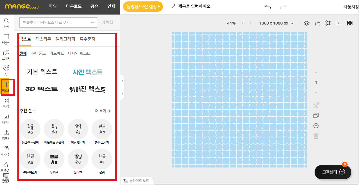 - 마음에 드는 배경을 설정 후, 왼쪽 사이드탭에서 "텍스트"로 클릭하여 원하는 글씨체를 선택합니다.